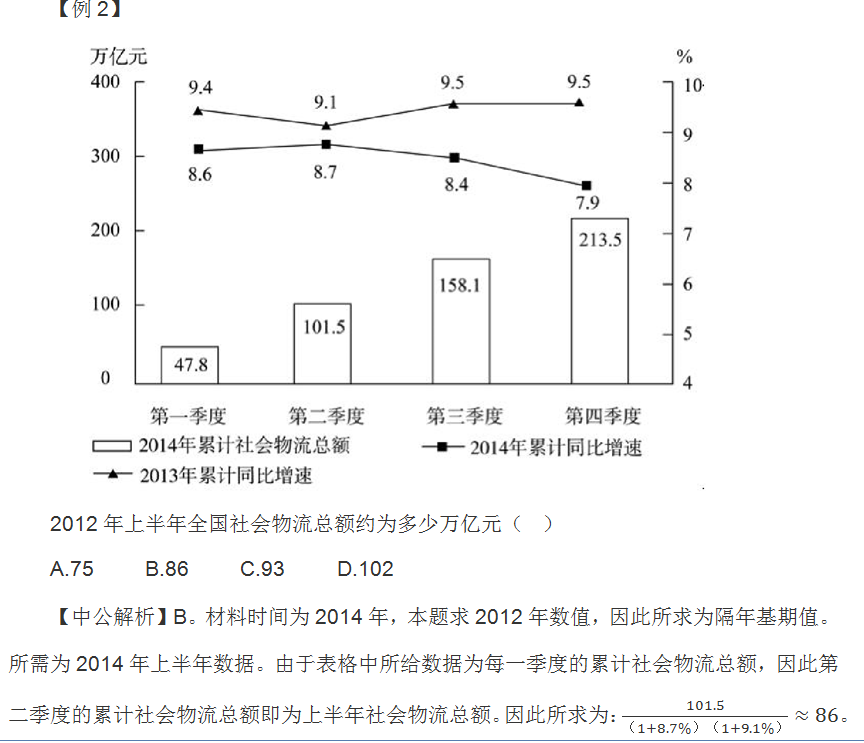 考试中,大家往往习惯于材料给出的是某年或某月的统计项。然而,给出的数据有时也会是时间段,他们通常的表现为1~7月,第四季度累计等形式。此时材料中所给数值为这一时间段内的累计数值,而不再是某个月或某个季度的单独数值。