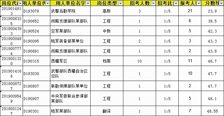 分数线是按照招聘人数定的。比如,此岗位招聘3人,按照2019入围比例1:5,要有15人进入面试,正常情况下,第15名同学的分数就是这个岗位的分数线。如果此岗位实际上只有12人报名。按照军队文职的面试入围规则,第12名的分数就是这个岗位的入围线。
