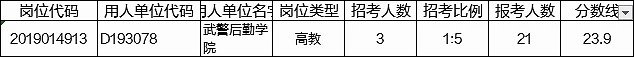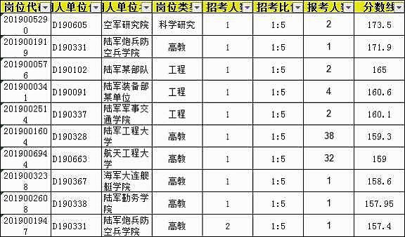 2019年文职考试最高分数线是北京空军研究院的研究实习员岗位,这个岗位只有1个人报名,不是热门岗位,分数线具有很大的偶然。