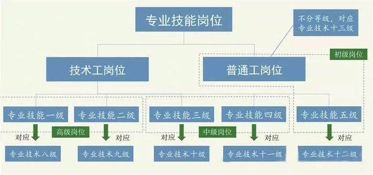 技术工岗位等级,由高到低设专业技能一级至五级,分别对应专业技术八级至十二级;普通工位不分等级,对应专业技术十三级,专业技能一级、二级位为高级岗位,专业技能三级,四级为中级岗位,专业技能五级岗位和普通工岗位为初级岗位。